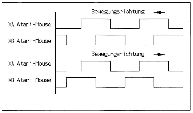 Aus den phasenverschobenen Impulsfolgen an XA und XB wird die Bewegungsrichtung abgeleitet. Wenn man diese als Binärzahl auffaßt, so zählt die Maus 2 0 1 3 2 0 usw. für eine Linksbewegung und 0 2 3 10 2 usw. für eine Rechtsbewegung. Das gleiche gilt für die vertikale Bewegung der Maus (hier nicht dargestellt).