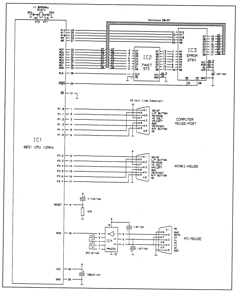 Wie aus dem Schaltbild zu ersehen ist, besteht die Schaltung des PC-Maus-Interfaces hauptsächlich aus dem Einchip-Mikrocomputer 8031, der mit seinen drei I/O-Ports und der eingebauten seriellen Schnittstelle einen sehr kompakten Schaltungsaufbau ermöglicht. Port 0 (AD0 ... AD7) ist ein gemultiplexter Adreß- und Daten-Port. Ein H-Pegel an der ALE-Leitung (Pin 30) deutet an, daß P0 nun die niederwertigen Adreß-Bits A0... A7 führt, die durch IC 2 (74HCT573) zwischengespeichert werden und zusammen mit den Daten an Port 2 (A8 ... A12) die Adresse für das EPROM IC 3 bilden. Ein L-Pegel auf der ALE-Leitung dagegen deklariert Port 0 zum Datentor für das EPROM. Damit sich das EPROM im übrigen angesprochen fühlt, produziert der Microcomputer das PSEN-Signal (Pin 29), mit dem er das EPROM selektiert. Der 8031-Einchip-Mikrocomputer wird mit 11.0592 MHz getaktet. Diese Frequenz ergibt sich aus der Forderung, daß die PC-Maus ihre Daten mit einer Baud-Rate von 1200 Bit überträgt und der interne Timer des 8031-Einchip-Mikrocomputers auf diese Baud-Rate programmiert werden muß.