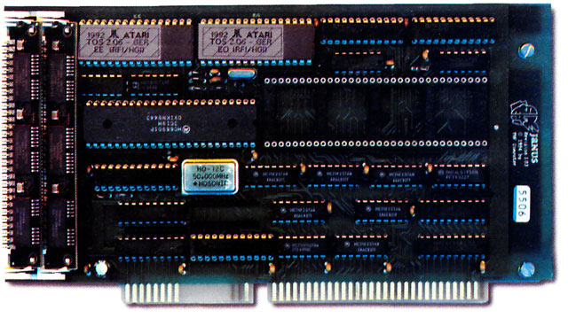 Das Janus-Board ist eigentlich ein "kleiner ATARI", der über den ISA-Bus in einen PC eingesteckt werden kann. "Kleiner ATARI" deshalb, weil das Board sämtliche wichtigen Komponenten wie z.B. CPU, TOS-Bausteine und die Speicherelemente beinhaltet. Hinzu kommt eine Emulatorsoftware, die für die Koordinierung der vom PC- und ATARI genutzten Bauteile wie z.B. Monitor, Tastatur usw. zuständig ist. Nach Inbetriebnahme hat der PC nun Zugriff auf maximal 14MB Ram-Speicher sowie die ROMs mit dem ATARI-Betriebssystem TOS 2.06. Das neue 68020-Board wird serienmäßig mit einer Taktfrequenz von 25 MHz ausgeliefert, was sich sehr zum Vorteil der Gesamtperformance auswirkt (Bild 1-3).