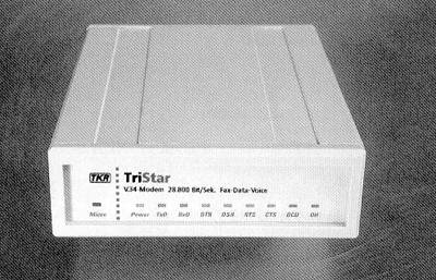 Wir konnten ein Vorseriengerät testen. Nachdem die Kieler Firma TKR seit Mitte Januar mit dem TKR FastLine V.34 zu den wenigen Firmen gehört, die 28800er Modems mit Unterstützung der neuen ITU V34 Norm tatsächlich ausliefert, hörten wir von Gerüchten über ein neues TKR- Modem. Auf Nachfrage erfuhren wir, daß in der Tat ab Mitte März die Auslieferung eines neuen Modems unter der Bezeichnung TKR TriStar geplant ist. Nach einigem Zögern war TKR bereit, uns das z.Zt. einzige verfügbare Vorserienmuster zum Test zu stellen.