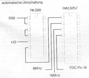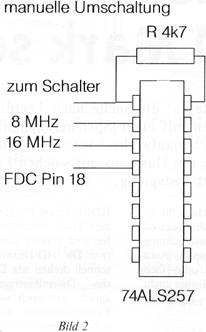 Pin 1 des 74ALS257 über einen Widerstand von 4k7 mit Pin 16 (+5V) verbinden. Einen Anschluss des Schalters an Masse löten, den anderen an Pin 1 des ICs. An Pin 2 wird der 8MHz-Takt eingespeist. Den findet man an dem auf der Atari-Platine verbliebenen Rest des durchgekniffenen Controlleranschlusses, bzw. dem freien Platz im Sockel, oder an Pin 15 der CPU. Der 16MhzTakt gehört an Pin 3 des 74ALS257. Lieferant ist Pin 39 des Shifters. Pin 4 vom 74ALS257 an den verwaisten Anschluss 18 des Floppycontrollers löten. Jetzt noch Pin 8 und 15 mit Masse und Pin 16 mit +5 Volt verbinden, einen 100nF Kondensator dazwischen, und einem DD/HD-Betrieb steht prinzipiell nichts mehr im Wege.