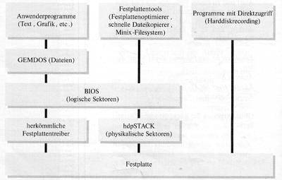 Aus Bild 2 wird die Einbindung von hdpSTACK auf unterster Systemebene deutlich. Die Kompression funktioniert also auch bei einer Umgehung des GEMDOS, so daß sie auch für das Betriebssystem völlig unsichtbar bleibt. Auf von hdpSTACK verwaltete Laufwerke haben andere Festplattentreiber normalerweise keinen Zugriff, d.h. ohne hdpSTACK existieren diese gar nicht.