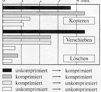 Neben den Ergebnissen aus dem How-Fast-Test, sind für die Praxis sicher die Geschwindigkeiten beim Dateikopieren von Interesse. Aus diesem Grund habe ich einen Ordner mit 7275 KB in 42 Unterordnern und 305 Dateien auf verschiedene Partitionen kopiert. Hierbei wird ein Nachteil der aktuellen Version deutlich: Da die Kornpression auf unterster Ebene abläuft, tritt beim Kopieren auf komprimierten Partitionen das oben bereits beschriebene unnötige Aus- und Einpacken der Daten auf, das natürlich Zeit kostet. Deshalb wäre eine direkte Übertragung der komprimierten Daten wünschenswert. Zu empfehlen ist auf jeden Fall der Einsatz eines schnellen Dateikopierers (Kobold), der die Zeiten wesentlich verkürzen kann. Weiterhin läßt sich erkennen, daß das Auspacken der Daten wesentlich schneller abläuft als das Komprimieren. Das liegt daran, dass ein kürzerer Plattenzugriff stattfindet und die Daten beim Auspacken nicht erst aufwendig analysiert werden müssen. Deswegen macht sich sich die Dekompression z.B. beim Laden von Programmen kaum bemerkbar.