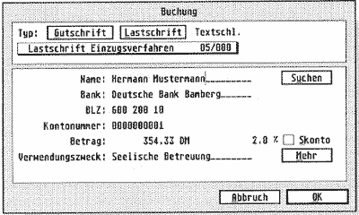 Buchungen sind sehr schnell durchzuführen. Grundsätzlich verfügt das Programm über zwei übergeordnete Buchungsarten: "Gutschrift" bzw. Überweisung und "Lastschrift" bzw. Abbuchung. Diese sind des Bedienungskomforts halber direkt über zwei Buttons anwählbar. Da es aber auch innerhalb dieser Buchungsarten Differenzen gibt, die in einigen seltenen Fällen benötigt werden, gelangt man mittels eines Pop-Up-Menüs an alle anderen Buchungsvarianten. Anschließend geben Sie den Kundennamen ein. Sollte der Kunde bereits in der Kundendatei enthalten sein, genügt ein Kürzel. Mit Hilfe des Suchmodus gelangen Sie schnell an alle Daten. Ist der Kunde jedoch nicht in der Datenbank, kann er direkt eingegeben werden. In diesem Zusammenhang fiel uns negativ auf, daß die hier neu eingetragenen Kundendaten nicht automatisch in die Kundendatei eingefügt werden. Beim jeweils ersten, neuen Kunden bedeutet dies nämlich den doppelten Arbeitsaufwand. Wie in Bild 3 zu sehen ist, kann der Verwendungszweck auch länger als nur eine Zeile ausfallen, ein Druck auf den Button "MEHR" öffnet neue Zeilen. Desweiteren gibt es die Möglichkeit, ein automatisches Skonto einzufügen, was besonders für gewerbetreibende interessant sein dürfte. Selbstverständlich sind die Skontensätze frei editierbar.