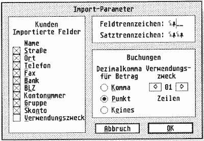 Wie in Bild 2 zu sehen ist, können hierbei sämtliche Importfelder ausgesucht bzw. abgeschaltet werden. Zusätzlich können die Feldtrennzeichen und Satztrennzeichen (letztere trennen die einzelnen Kunden) variabel gestaltet werden. In Verbindung mit einer exportfähigen Finanzbuchhaltung können Sie sinnvollerweise auch die Einstellungen der Buchungen inklusive Verwendungszweck einstellen. Aufgrund der Tatsache, daß inzwischen fast jede Adreßverwaltung Exportmöglichkeiten besitzt, sollte es also keine Schwierigkeiten beim Importieren externer Daten geben. In unserem Test wurden knapp 200 Datensätze innerhalb weniger Minuten importiert. Bei nur zwei Sätzen tauchten Probleme auf, da die Exportdatei in diesen Punkten unvollständig war. Desweiteren stellten wir fest, daß "E-Banking" merkwürdigerweise den jeweils letzten Datensatz nicht erfassen kann. Abhilfe kann man jedoch schaffen, indem man mittels eines Text- bzw. ASCII-Editors einen Pseudo-Satz erstellt, der ohnehin nicht gelesen wird.
