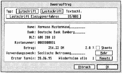 Daueraufträge sind immer dann sinnvoll, wenn Sie in regelmäßigen Abständen die gleichen Beträge an die gleichen Kunden überweisen, bzw. von den Kunden abbuchen möchten. Angenommen, Sie bezahlen Ihren Vereinsbeitrag im Abstand von 3 Monaten (vierteljährlich), so können Sie dies entsprechend eingeben. Dabei können auch die Intervalle frei editiert werden. Als ersten Termin hält der Computer das aktuelle Arbeitsdatum fest. Daueraufträge haben den Vorteil, daß Sie sich um solch regelmäßigen Geldtransfer nicht mehr kümmern müssen. Sobald eine neue Buchung, resultierend aus einem Dauerauftrag, fällig wird, fragt der Computer bei der nächsten möglichen Nutzung der Software nach, ob diese Buchung durchgeführt werden soll - der Anwender braucht nur noch zuzustimmen (falls er nicht aus dem Verein ausgetreten sein sollte).
