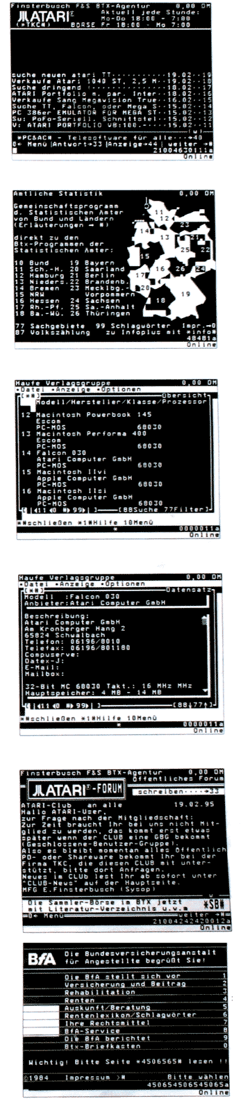 Der "Bildschirmtext", BTX, vornehmer heute: Datex-J oder inzwischen sogar T-Online, ist in die Jahre gekommen, hat aber gerade in letzter Zeit an Akzeptanz hinzugewonnen, wie die inzwischen 700.000 Teilnehmer beweisen. Da man schon mit einfachen Modems mit dem ATARI Btx betreiben kann (z.Z. werden nur 2400 baud Transfergeschwindigkeit benötigt), soll hier ein kleiner Rundblick zeigen, was von den vielen Angeboten, die sich im Btx tummeln, interessant sein könnte. Dies ist jedoch kein Gerätetest. Die Hard- und Softwareanforderungen sind bisher auch glücklicherweise noch gering. Dies mag an der Abwärtskompatibilität liegen, die man aus Rücksicht auf Datex-J-Teilnehmer, die noch altertümliche Geräte wie "MulitTel" nutzen, achtet. ATARI-Besitzer, die nur über einen sw-Monitor verfügen, profitieren davon, denn auch wenn von BTX aus vielfarbige Seiten gesendet werden, geht in der Regel keine Information auf der s/w-Seite verloren.