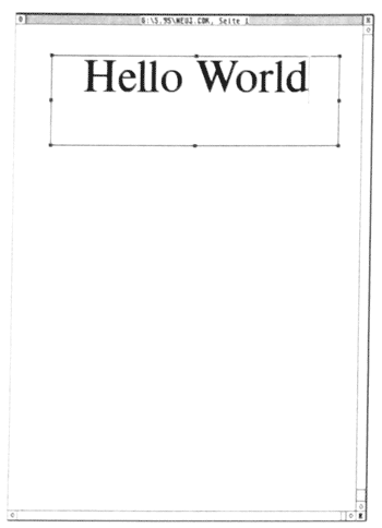 Es erscheint sinnvoll, dass wir als ersten Schritt einfach einen Textrahmen erstellen in dem das beliebte "Hello World" erscheinen soll. Hierfür müssen jedoch zunächst die Pfade richtig eingestellt werden. Unter dem Menüpunkt EXTRAS kann man die entsprechende Option finden. Durch das Anklicken des jeweiligen Pfades, z.B. für die FONTS, erscheint eine Fileselect-Box. In dieser Box suchen Sie den Ordner, in dem die entsprechenden Daten sind und bestätigen mit OK. Nicht für alle Komponenten werden vorgefertigte Ordner geliefert. Wählen Sie in diesem Fall das Calamus1.09n - Wurzelverzeichnis. Wechseln Sie anschließend zum Menüpunt DATEI und wählen Sie den Menüpunkt "Neu anlegen" an. Es erscheint die Ganzseitendarstellung eines DIN A4-Blattes. Bewegen Sie den Mauspfeil auf einen beliebigen Punkt im linken Teil des Fensters. Durch Drücken der linken Maustaste öffnen Sie einen hellgrauen Rahmen. Wie Sie sehen, können Sie die Größe beliebig variieren. Halten Sie sich bei der Erstellung des Rahmens in etwa an die Vorgabe aus Bild 2 (nächste Seite). Wählen Sie nun in der oberen IconLeiste das Symbol "A" an. Das seitliche Fenster ändert den kompletten, Inhalt (Bild 3), da Sie nun im Textmodus "gelandet" sind. Innerhalb dieser Einstellung können Sie mit Hilfe der Maus einen Cursor in dem von Ihnen erstellten Rahmen aktivieren. Dieser Text-Cursor blinkt am linken oberen Rand des Rahmens. Nun können Sie einen beliebigen Text eingeben (bei uns "Hello World"). Betätigen Sie nun den fünften Button von links im seitlichen Fenster. Es erscheint eine Oberfläche wie in Bild 4. Das Hauptaugenmerk fällt auf die Icons für die Textausrichtung. Darunter sind die einzelnen Werte für den Zeilen- und den Absatzabstand.
