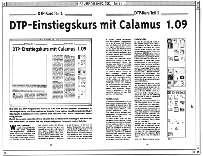 Mit Hilfe des DTP-Programmes Calamus 1.09 sind ATARI-Computer bundesweit in Werbeagenturen und Satzstudios im Einsatz. Trotz seiner gewöhnungsbedürftigen Oberfläche kristallisiert sich schnell eine intuitive und leicht erlernbare Bedienung heraus. Durch den enorm niedrigen Preis können Sie zu Hause den Einstieg in die Welt des DTP realisieren. Im ersten Teil des Kurses zeigen wir Ihnen die ersten Schritte.