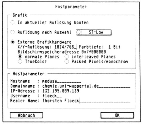 Unter Punkt 3 der Dialogbox des Installationsprogrammes werden die Maschinenparameter des einzurichtenden Linux/68k-Systems eingestellt. Dies beginnt mit der Auswahl der Grafikauflösung. Die Beschreibung der einzustellenden Parameter lässt insbesondere bei der Verwendung einer Grafikkarte etwas zu wünschen übrig, jedoch mit etwas Ausprobieren sollte dies zu bewerkstelligen sein. Der erste Punkt "In aktueller Auflösung booten" wird dann benutzt, wenn das System beim derzeitigen Betrieb unter TOS in der zukünftig unter Linux gewünschten Grafikauflösung betrieben wird und diese Auflösung nicht über eine Grafikkarte bereitgestellt wird. Sollte die derzeitige Auflösung nicht dem unter Linux gewünschten entsprechen, benutzt man die Auswahl "Auflösung nach Auswahl" mit dem nebenstehenden Pop-Up. Auch hier darf wieder keine eine Grafikkarte im Spiel sein, denn diese muss über den dritten Punkt "Externe Grafikkarte" aktiviert werden. Hierbei sind mehrere Angaben erforderlich. Die Angabe der X/Y-Auflösung dürfte trivial sein, jedoch schon der zweite Parameter "Farbtiefe" erfordert einige Überlegung. Für eine s/w Darstellung ist hier der Wert 1 einzustellen, für 16 Farben 4 und für 256 Farben 8. Anschließend wird nach der Bildschirmspeicheradresse in hexadezimaler Form gefragt. Das in der Beschreibung der ALD genannte Programm zur Ermittlung dieser Adresse fehlt bisher im Lieferumfang und man ist auf andere Programme wie Sysinfo, VMG oder den Hersteller seiner Grafikkarte angewiesen. In Tabelle 1 findet man für einige gängige Grafikkarten die entsprechenden Parameter. Der letzte anzuklickende Punkt unter den Grafikparametern für den Betrieb einer Grafikkarte hängt stark von dieser ab. In s/w werden üblicherweise "normale Planes" und bei 16 oder 256 Farben oftmals "Packed Pixels" verwendet.