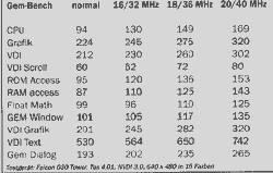 Nach dem Einbau können die verschiedenen Taktfrequenzen mit Hilfe eines CPX-Modules im Kontrollfeld softwaremäßig eingestellt werden. Über das Feld „System“ (siehe Bild 1) können Sie bestimmen, mit welcher Taktrate die CPU angesteuert wird. Das System arbeitet eigentlich mit einer Taktfrequenz von 32 MHz, wobei die meisten Komponenten, wie z.B. die CPU jedoch nur die Hälfte, also 16 MHz bekommen. Der hier veränderte Wert wirkt sich also direkt auf die CPU aus. Gleichermaßen wird das gesamte System in der Geschwindigkeit verdoppelt, da bei jedem Zugriff auf Speicher oder Peripherie-Geräte die CPU wieder heruntergeschaltet wird. Die höhere Taktfrequenz des Systemtaktes kommt der CPU immer dann zugute, wenn diese mit dem internen Cache arbeitet. Bei Umschaltung auf 36 MHz arbeitet das System folglicherweise mit 18 MHz, bzw. 36 MHz usw. Dieser Beschleuniger bringt grundsätzlich die gleichen Vor- und Nachteile, wie die Konkurrenzmodelle. Das komplexe Timing des Falcon lässt eine perfekte Lösung nur sehr selten zu. Daher kann es bei einigen Rechnern zu Abstürzen in höheren Taktraten kommen. Um jedoch eine individuelle Konfiguration zu ermöglichen, haben Sie im Kontrollfeld weiterhin die Möglichkeit, eine Feinabstimmung durch die Buttons 1,2,3,1, DM1, DM2 zu treffen.
