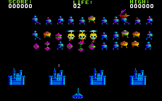 Bei "Space Invaders" darf nach Herzenslust geballert werden. Eine Angriffsformation feindlicher Raumschiffe nähert sich einem Geschütz, das vom Spieler am unteren Bildschirmrand hin und her bewegt wird. Zwischen den Gegnern und der Kanone befinden sich drei Barrikaden, die vor Raketen aus dem All schützen. Alle Raumschiffe müssen abgeschossen werden, bevor sie unten landen, sonst verliert man ein Bildschirmleben.