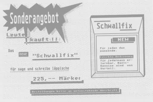 Das soll sich nun ändern. Jetzt gibt es "Schwallfix", das Software-Modul für den Vielschreiber! Wer kennt nicht die folgende Situation? Morgen hat Tante Margot ihren 80. Geburtstag, und beim Nachmittagskaffee fällt uns siedendheiß ein: Eine Tischrede muß her, und zwar eine, die sich gewaschen hat. Sie darf nicht zu vertrackt sein, damit unser Onkel Adalbert mitkommt, andererseits aber auch nicht zu seicht, um Studienrat von Schleicher nicht zu ungewollten Lachsalven zu veranlassen.
