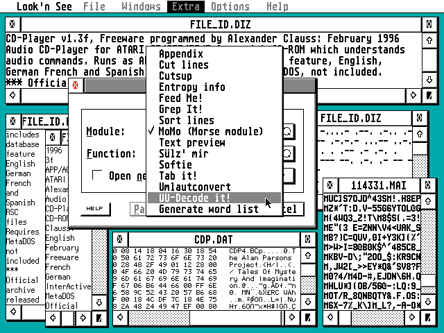 reads text aloud,[it's aimmed at readimg German text, so don't expect perfect English - FFF] a word list generator, uudecode tool and many others.