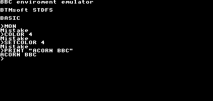After the start you will see a simple basic environment similar to MS-DOS: No introduction screen, no options - there are no emulator hotkeys except the UNDO key which resets the virtual BBC. The emulator works only in ST medium which is identical to the BBC's high resolution graphic. You can type in and start basic programs but assembler programs or more complex basic programs won't run. The programs are saved directly to a TOS disk and so there is no possibility to use disk images.