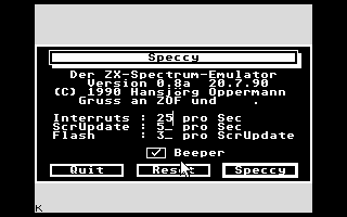 (Configuration screen of Speccy)Speccy is not very popular - maybe because it is forbidden to publish it via PD libraries. This emulator is also good and understands basic and assembler programs. Compared to ZX-Sp you will notice that Speccy is not as comfortable, doesn't support snapshots and is not so compatible. The emulator also crashes from time to time. There is only one advantage: Speccy is smaller and so a bit easier to use. Since the last version is from 1990 there seems to be no further development. A program to transfer Spectrum programs to the ST is supplied with Speccy. All programs and manual in the Speccy package are in German language.