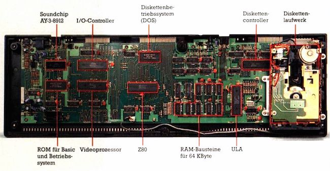 Bei der Diskettenstation handelt es sich um das gleiche 3-Zoll-Laufwerk, welches fĂŒr den CPC 464 unter dem Namen DD1, beziehungsweise FD1, angeboten wird. Dadurch, daĂ das Netzteil im Monitor eingebaut ist, ist das GerĂ€t nicht tiefer als die Konsole selbst. Der Platz, an dem sich bei dem kleinen Modell CPC 464 der Kassettenrecorder befindet, reicht somit fĂŒr das Diskettenlaufwerk aus. Der Controller fĂŒr bis zu zwei Stationen ist auf der Hauptplatine integriert, die deshalb auch ein vollstĂ€ndig neues Layout erhielt. Dabei wurde dem Drucker-AnschluĂ leider wieder nur ein 7 Bit breiter Datenbus spendiert. Dies erlaubt zwar den Drucker von Schneider, den NLQ 401, zu benutzen, der AnschluĂ fremder GerĂ€te wird aber erschwert. Ein Fehler in der Entwicklung oder die Absicht anderen Druckerherstellern eins auszuwischen?