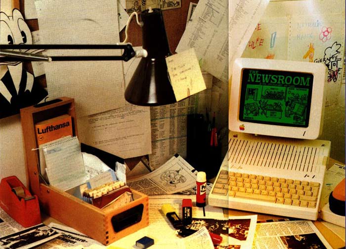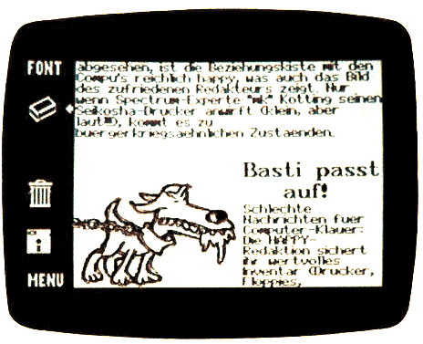 Die Schreibarbeit und das Mischen von Text und Fotos werden am »Copy Desk« erledigt. Wie bei einer normalen Textverarbeitung wird das Manuskript einfach über die Tastatur eingetippt; auf deutsche Umlaute muß man leider auch bei diesem amerikanischen Programm verzichten. Tippfehler können allerdings leicht durch die DELETE-Taste korrigiert werden. Bestimmte Textstellen fährt man mit den Cursortasten oder Joystick an. Paßt ein Wort nicht mehr in eine Zeile, wird es automatisch in die nächste übernommen. Mehr Komfort gibt es nicht. Mit einer »richtigen« Textverarbeitung kann der Newsroom es nicht aufnehmen, doch die vorhandenen Funktionen reichen zum zügigen Tippen und Editieren völlig aus.
