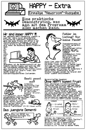 Happy-Computer sucht nämlich die Schülerzeitung, die den originellsten, informativsten oder auch ausgefallensten Beitrag zum Thema Computer enthält, egal, ob es ein Artikel für den Informatik-Unterricht oder ein unterhaltender Beitrag über Heimcomputer ist. Die Redaktionen der drei Zeitungen mit den besten Beiträgen werden mit je einem Newsroom prämiert.