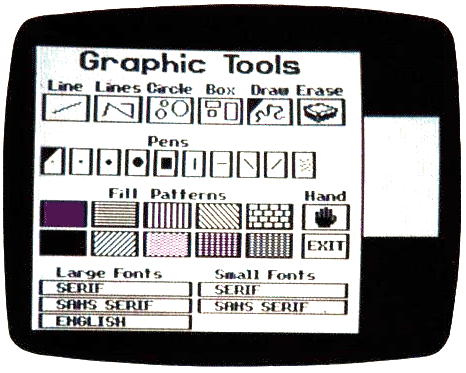 Der optische Aufmacher einer Zeitung ist das »Banner«, die Kopfzeile, auf der in großen Lettern der Name der Publikation prangt. Im entsprechenden Untermenü wird man beim Zusammenstellen des Banners mit einigen wichtigen Funktionen des Programms vertraut gemacht, wie zum Beispiel die Wahl der Schriftart. Für Großbuchstaben gibt es drei, für Typen in der kleineren Textgröße nur zwei Schriftarten. Man kann zwar mit diesem etwas kargen Angebot leben, aber etwas mehr Auswahl hätte sicher nicht geschadet. Auf dem Bildschirm sieht man eine leere Fläche, die mit der Kopfzeile gefüllt werden soll. Am linken Rand fällt ein Menü auf, dessen Punkte durch kleine Grafiken symbolisiert werden. Diese Art der Menüführung findet sich im ganzen Programm wieder. Um jetzt den Namen der Zeitung zu schreiben, wählt man einfach die Schriftart und positioniert den Cursor an der gewünschten Stelle auf dem Bildschirm. Der Titel kann nun über die Tastatur eingetippt werden.