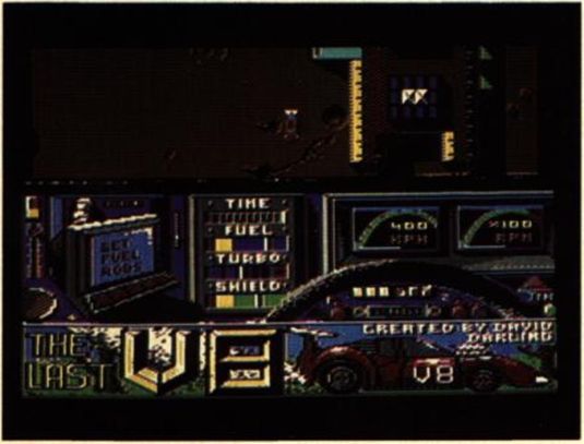 »The last V8« ist ein grafisch eindrucksvoller Geschicklichkeitstest mit dramatischer Rob Hubbard-Musik. Das Spiel ist allerdings unverschämt schwer und hat schon so manchen Nervenzusammenbruch auf dem Gewissen. Bei der C 64-Version gibt es zwei Spielstufen, in der neuen C 12ß-Version gleich deren drei. Man steuert sein V8-Auto nicht auf und unter der Erde, sondern auch auf dem Mars.