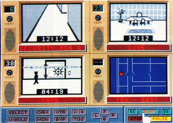 Auf dem heimischen Computer-Bildschirm sehen Sie nun die Bilder von vier Monitoren. Mit Maus oder Joystick bewegen Sie eine Hand über eine Reihe von Knöpfen, die am unteren Bildschirmrand zu sehen sind. Durch Anklicken von «Mon« empfangen Sie auf einem Monitor die ständig wechselnden Kamera-Bilder, die auch der Wachmann im Kontrollraum präsentiert bekommt. Sie können sich natürlich ruhigen Gewissens vor einer Kamera tummeln, deren Bild gerade nicht auf dieser Leitung gesendet wird. Es empfiehlt sich, die Signale des Kontrollraum-Bildschirms ständig zu beobachten, damit man weiß, was der Gegner gerade sieht.