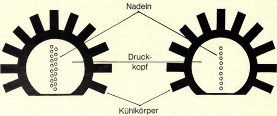 Ein sinnvolles Preis-/Leistungsverhältnis findet man bei den gerade in letzter Zeit deutlich günstiger gewordenen Nadeldruckern. Bei diesem Druckertyp wird die Schrift erzeugt, indem sich der Druckkopf beim Druckvorgang zeilenweise über das Papier bewegt, wobei jeweils bestimmte im Druckkopf vorhandene Nadeln auf das Farbband schlagen und dadurch Punkte auf dem Papier erzeugen. Das Problem bei dieser Art von Schrifterzeugung ist, daß man die kleinen Punkte, aus denen die Buchstaben aufgebaut sind, noch sehen kann. Eine Art das Druckbild zu verbessern wurde durch ein zweimaliges, etwas versetztes Drucken derselben Buchstaben erreicht, wodurch die Punkte fließend ineinander übergingen und der Eindruck einer geschlossenen Linie entstand. Auf diese Weise entstand die Near-Letter-Quality-Schrift (NLQ). Diese Art des Druckens kostet natürlich Zeit, da ein doppelter Anschlag erfolgt. Daher hat man Drucker mit 18,24 und sogar 32 Nadeln entwickelt. Der Druckkopf hat dann nicht nur eine Reihe von 8 oder 9 Nadeln, sondern zwei etwas versetzte Reihen zu 9, 12 oder 16 Nadeln (Bild 1). Dadurch ist ein zweiter Druck der Buchstaben überflüssig geworden, weil beide Drucknadelreihen gleichzeitig sehr exakt drucken können. Mit dieser Methode wird sogar Letter-Quality (LQ) erreicht, die kaum noch von einer Schreibmaschinenschrift zu unterscheiden ist.