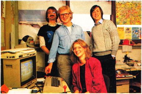 Die Belegschaft von Activision Deutschland ließ es sich nicht nehmen, die Urkunden für die von Happy-Computer ausgezeichneten Spiele »Alter Ego«, »Spindizzy« und »Leather Godesses of Phobos« persönlich in unserer Redaktion abzuholen. Unser Bild dokumentiert dieses Gipfeltreffen. Eingeweihte erkennen von links nach rechts Heinrich Lenhardt (Happy), Winrich »Winnie« Derlien und Kathrin Ewaldsen (beide Activision) sowie Boris Schneider (Happy).