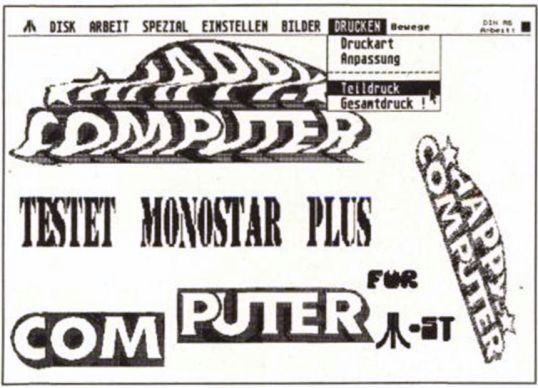 Natürlich sind alle geometrischen Standardfunktionen enthalten. Ebenso wie das Füllen mit selbstdefinierten Mustern und der frei definierbare »Radiergummi«. Intelligent ist die Bild-Laderoutine. Sie erkennt selbsttätig die wichtigsten Fremdformate, so auch Degas und Doodle. Mit der Speicherroutine läßt sich leider nur das Monostar-Format erzeugen. Sinnvoll und diskettenplatzsparend ist das Speichern und Laden von Bildausschnitten