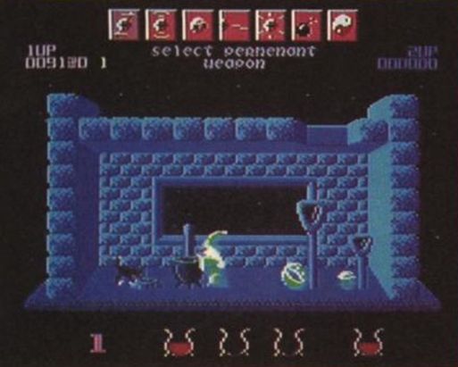 Schließlich folgt eine Atempause im Labor des Zauberers, der sich vorübergehend vom Wizball in den Wiz zurück verwandelt und die gewonnene Farbe in einen Zaubertrank rührt. Während man zuschaut, wie dieses magische Süppchen gebraut wird, darf man sich ein Geschenk aussuchen: eines von mehreren Extras, das auch dann erhalten bleibt, wenn man ein Leben verliert!