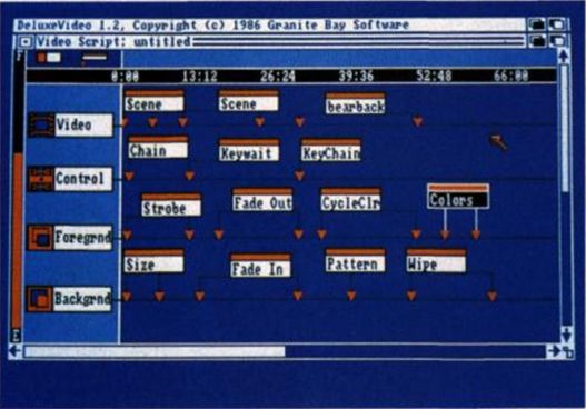 Das Hauptprogramm von Deluxe Video ähnelt einem Drehbuch, in dem geschrieben steht, wann was wo erscheint und was damit geschieht. Alle Ereignisse werden wie auf einem Tonband auf Spuren festgehalten und beim Abspielen des Videos durch sie gesteuert. Auf der Musikspur steht beispielsweise, wann die Musik geladen wird, wann sie einsetzt und wie lange sie spielt. Wer dabei gleich an komplizierte Notenlinien denkt, irrt sich. Das Geheimnis von Deluxe Video sind die Effekt-Boxen.
