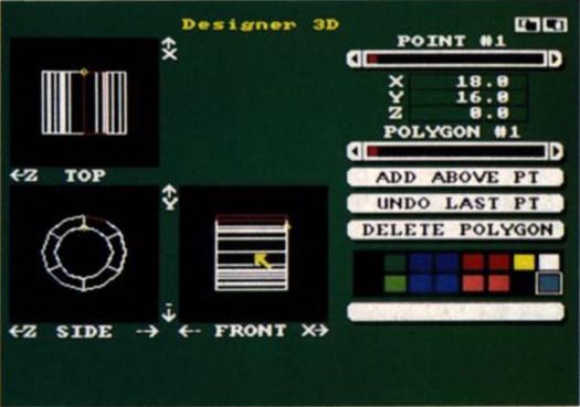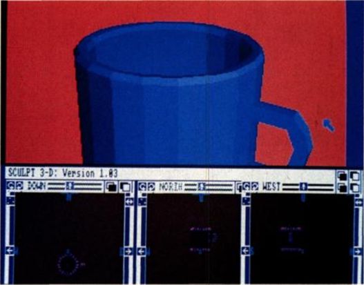 Sculpt 3D arbeitet genau wie Videoscape mit Drahtmodellen als Grundlage für die Bilder. Die Eingabe erfolgt hier aber direkt im Programm, ohne weitere Editoren. Was bei den Eingabe-Fenstern sofort ins Auge fällt, sind die vielen Felder an den drei Eingabefenstern. Sie sind die ersten Konstruktionshilfen, die Sculpt 3D zur Verfügung stellt. Auch in den Menüs stehen eine Menge nützlicher Funktionen, die man immer wieder braucht. Alle Objekte und Figuren basieren bei Sculpt 3D nämlich auf Dreiecken.