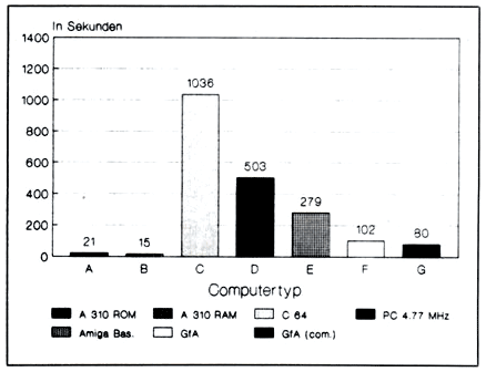Vergleichbar mit diesen Daten sind derzeit vom Preis her nur der Atari Mega ST und der Amiga 2000 zu nennen. In puncto Geschwindigkeit kommt an den Archimedes bestenfalls eine 30000-Mark-Workstation wie die »Sun« heran. Selbst einen Mikrocomputer wie die »VAX 11/780« läßt er hinter sich zurück. Interessant für einen Vergleich ist auch ein MS-DOS-PC, den der Archie ja emulieren kann, durch seinen Preis (angesetzt mit einer EGA-Karte und entsprechen dem Monitor). In einem Basic-Benchmark zeigte sich deutlich, wie groß die Geschwindigkeits-Unterschiede zwischen den einzelnen Computern sind. Von der Komplexität der Basic-Dialekte kann allenfalls das GFA-Basic des Atari ST noch mithalten — bei der Geschwindigkeit muß schon ein Compiler her.