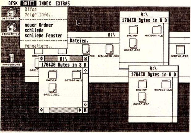 GEM kann bis zu sechs Fenster auf dem Bildschirm verwalten. Jedoch kann man beim Desktop nur vier Diskettenverzeichnisse öffnen. Ein Fenster ist reserviert für ein Pull-Down, das andere für eine andere Anwendung.