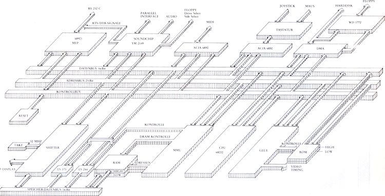 Das nebenstehende Blockschaltbild zeigt einem in übersichtlicher Weise das Zusammenwirken der einzelnen Bausteine des ATARI ST Systems. Fast alle Komponenten sind an drei Busse angeschlossen. Unter einem Bus versteht man den Verbund von mehreren Leitungen, die zur Datenübertragung oder zu Steuerzwecken dienen. Die wichtigsten Busse sind im folgenden kurz erklärt. Da wäre zuerst der 16 Bit breite bidirektionale Datenbus, der für den Datentransport zwischen dem Prozessor und den übrigen Bausteinen zuständig ist. Des weiteren wäre da der Adressbus, der 23 Bit breit ist und nur in eine Richtung betrieben wird. Er wird vom Prozessor dazu benutzt, die Speicherchips,.-sowie auch andere Peripheriebausteine, zu adressieren. Der Dritte im Bunde der wichtigsten Busse ist der Kontrollbus. Auf ihm werden die Kontrollsignale zur Selektierung und Überwachung der meisten Chips geführt.
