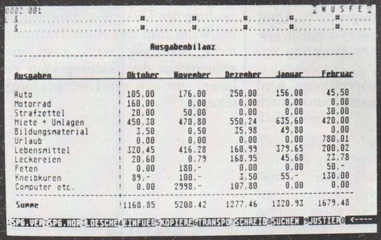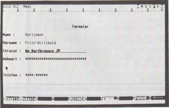 Die Erstellung solcher Formulare wirft keine Probleme auf. Man markiert die Textfelder, in die nachher die betreffenden Daten eingegeben werden sollen, mit der betreffenden Anzahl von Füllzeichen (’ ★ ’). Der Cursor springt im Formularmodus automatisch in die definierten Textfelder und fügt die eingegebenen Daten in den Gesamttext ein. Während der Eingabe kann man den Cursor auch nicht aus diesen Textfenstern herausbewegen, wodurch Überschreibungen des Haupttextes verhindert werden. Diese Fähigkeit dürfte besonders für berufliche Anwender interessant sein, wobei auch die Rechenfähigkeit des Programmes hier erst richtig zur Geltung kommt.