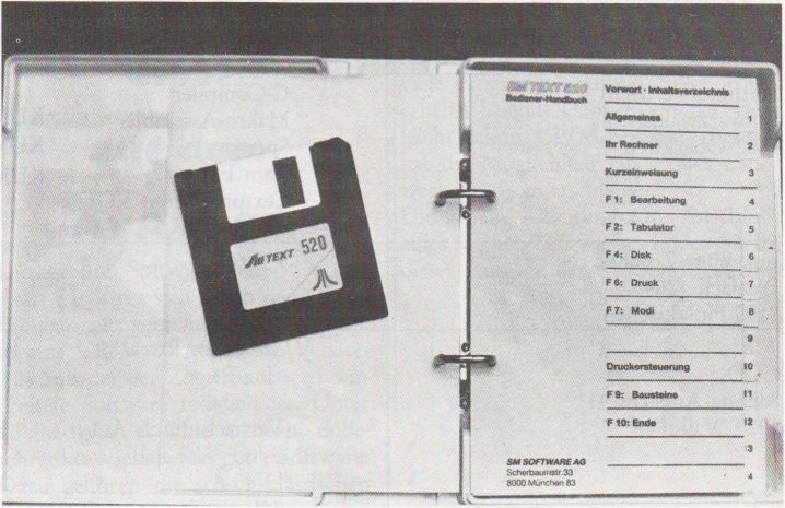 Was nützt der beste Computer ohne gute Software. Die meistgebrauchten Programme sind: Dateiverwaltung, Kalkulationsprogramme und Textverarbeitung. Ein Programm der letztgenannten Kategorie ist das SM-Text 520 von der deutschen Firma SM aus München. Das Programm wird von ATARI unter dem neuen Namen ’ST Manager Text’ zum Preis von 239,- DM vertrieben.