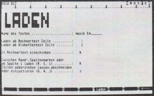 Bei allen Diskettenoperationen wird der aktuelle Textname automatisch eingetragen. Dies ist allerdings unbedingt notwendig, da das Inhaltsverzeichnis der Diskette nicht verfügbar ist. Wenn man also einen Textnamen nicht auswendig weiß, muß man zwangsweise das Textprogramm verlassen, um sich das Directory anzuschauen.