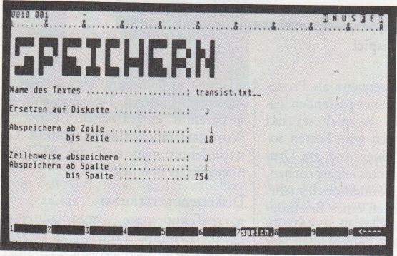 Beim Laden und Speichern von Texten bietet das Programm eine Vielfalt von Möglichkeiten. Es können nicht nur gesamte Texte geladen werden, sondern auch Teiltexte. Diese wiederum können in bestimmte Textstellen eingeschoben werden. Dies kann nicht nur zeilenweise, sondern ebenfalls spaltenweise, erfolgen (Bild 4). ST-Text unterstützt alle externen Speicher, welcher aus einer oder zwei Floppies, einer Harddisk oder einer Ramfloppy bestehen kann. Das Speichern von Texten (Bild 5) bietet auch die Möglichkeit, einen bestimmten Textausschnitt abzuspeichern. Diese Eigenschaften machen es möglich, Dokumente beliebig miteinander zu verknüpfen.