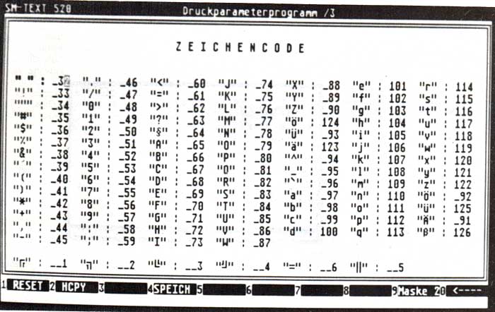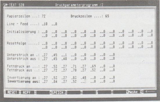Bei der Anpassung von verschiedenen Druckern ist das Textprogramm allerdings wieder sehr komfortabel. In einem Druckeranpassungsprogramm kann man jeden einzelnen Buchstabencode, der zum Drucker geschickt wird, verändern (Bild 6). Die Steuersequenzen können ebenfalls auf den benutzten Drucker zugeschnitten werden. Darunter fallen die Steuerkodes für Fettschrift, Inversschrift, Unterstreichen, sowie die Sequenzen zur Druckerinitialisierung und des Line-feed (Bild 7). Dies ermöglicht den Anschluß jedes Druckers mit paralleler Schnittstelle an den Atari ST. Das Programm bietet dafür die Möglichkeit 10 verschiedene Druckereinstellungen abzuspeichern, wobei eine gekennzeichnete Einstellung automatisch eingeladen wird.
