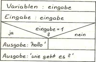 Dieses Programm wird Zeile für Zeile ausgeführt, es läuft also von oben nach unten durch. Diese Programmart nennt man Folgestruktur. Diese Struktur läßt sich einfach als Struktogramm (auch Strukturdiagramm oder Nassi-Shneiderman-Diagramm) darstellen (siehe Bild 2). Mit diesen Diagrammen werden alle grundlegenden Programmstrukturen erklärt. Sie eigenen sich sehr gut für die strukturierte Programmierung und haben die früher verwendeten Programmablaufpläne (PAP) ersetzt.
