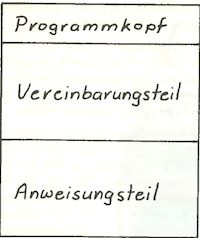 Jedes Pascal-Programm besteht, grob unterteilt, aus drei Teilen. Dies sind der Programmkopf, der Vereinbarungsteil und der Anweisungsteil. Der Programmkopf ist in vielen Pascalversionen zwingend notwendig. Bei Turbo-Pascal kann er jedoch weggelassen werden. Es empfiehlt sich aber trotzdem einen Programmnamen anzugeben, weil man damit den Inhalt des Listings beschreiben kann. Als Programmkopf wurde bei diesem Beispiel ’program multiplikation’ gewählt.