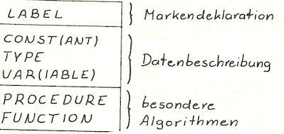 Nachdem nun bei diesem Beispiel auch mit einem Label gearbeitet wurde, ist es an der Zeit die Reihenfolge im Vereinbarungsteil darzustellen. Als erstes kommt die Labelvereinbarung, dann die der Konstanten, Typen, Variablen, Funktionen und zuletzt die der Prozeduren (siehe auch Bild 4). Funktionen, Prozeduren und Typen werden später im Text erklärt. Beim Vereinbaren muß man darauf achten, daß Namen bzw. Bezeichnungen nicht mehrmals verwendet werden. Die Compilierung wird dann mit ’Duplicate identifier or lable’ abgebrochen.