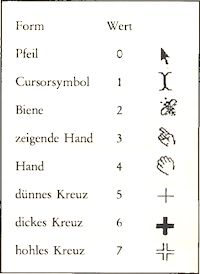 Wem diese sechs zusĂ€tzlichen Maussymbole nicht genĂŒgen, dem steht die Möglichkeit offen, eigene Symbole zu entwerfen. Bei manchen Programmen, die auf die Maus zurĂŒckgreifen ist es sinnvoll, wenn das Maussymbol etwas ĂŒber die momentane Aufgabe des Programmes aussagt (z. B. Stift, Pinsel, Radiergummi).