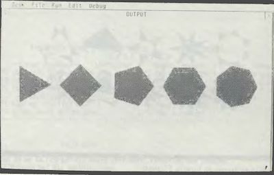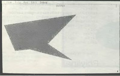 Ein Ă€hnlicher Befehl wie der vorherige, aber weitaus interessanter, ist der 'POLYGON'-Befehl. Mit ihm können FlĂ€chen zwischen verschiedenen Punkten ausgemalt werden (Bild 4). Im Gegensatz zu einem Basic-Programm mit 'LINEF' und 'FILL'-Befehlen arbeitet diese GEM-Routine wiederum wesentlich schneller. Es können hiermit auch alle erdenklichen geometrische Gebilde erzeugt werden. Das FĂŒllmuster kann mit dem 'CO-LOR'-Befehl definiert werden.