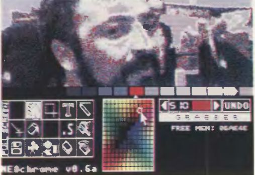 Besitzt man einen Farbmonitor, so kann man ein Bild in 16 Graustufen digitalisieren. Es wird hierbei die niedere Auflösung des Atari ST genutzt. Jede der 16 Grauwerte kann somit mit einer Fehlfarbe belegt werden. Die Farbwahl wird ähnlich wie bei dem bekannten Malprogramm Neochrom durchgeführt. Man wählt zunächst das zu ändernde Farbregister in einem Untermenü aus. Dann kann man in einer kompletten Farbpalette die neue Farbe anklicken. Ist einmal eine günstige Farbbelegung gefunden, kann diese Farbtabelle auch auf Diskette gespeichert und bei Bedarf wieder abgerufen werden. Die fertigen Bilder können natürlich auch auf Diskette gespeichert werden. Wahlweise legt man sie als komplette Bilder (beispielsweise 512 mal 286 Punkte) oder im Neochrom-Format ab. Mittels einer auf der Programmdiskette befindlichen Routine kann man aus dem Neochrom-Bild schließlich auch noch ein Bild im Degas-Format machen, sodaß die Weiterverarbeitung eines digitalisierten Bildes mit den beiden bekanntesten derzeit erhältlichen Malprogrammen für den ST sichergestellt ist.