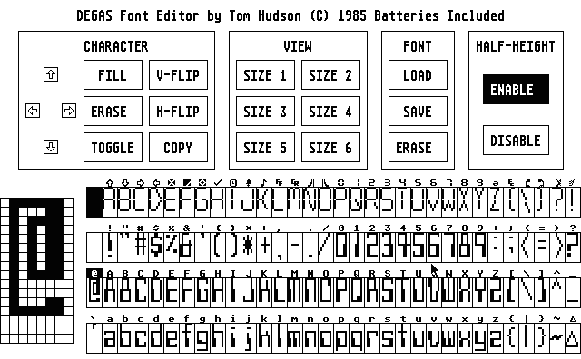 Auf der Diskette sind außer dem Zeichenprogramm noch einige sehr nützliche Programme enthalten. Dazu gehört ein komfortabler Zeichensatzeditor (siehe Bild). Das zu bearbeitende Zeichen wird dabei vergrößert dargestellt und kann gedreht, invertiert, gespiegelt und verschoben werden.
