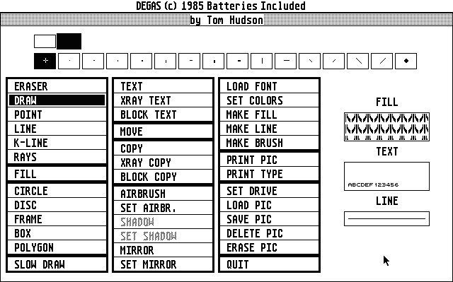 Degas ist ein sehr interessantes Mal- und Zeichenprogramm. Es arbeitet in allen Auflösungsstufen des ST mit der entsprechenden Anzahl von Farben. Wenn Degas auch nicht alle Möglichkeiten eines Zeichenprogramms bietet, wie zum Beispiel das nachfolgende EASY-DRAW, so liegt sein großer Vorteil in der einfachen Bedienbarkeit. Man muß nicht lange in der Anleitung herumblättern, um die Funktionen zu verstehen, sondern kann gleich mit dem Malen oder auch Zeichnen beginnen.