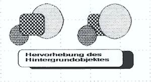 Während bei PAINT-Programmen jeder gemalte Strich, jede geometrische Figur oder jeder Text ein Bestandteil des Gesamtbildes ist, wird bei EASY-DRAW jedes gezeichnete Objekt einzeln gespeichert. Ein solches Objekt kann im Nachhinein verändert werden, ohne den Rest des Bildes zu beeinflussen. Falls eine Figur zu groß geraten ist, kann man sie nachträglich verkleinern, bis sie den Proportionen des Gesamtbildes entspricht. Ebenso kann man die Größenänderung nur auf eine Achsenrichtung beschränken, wodurch die exakte Dimensionierung bestimmter Teile keinerlei Probleme bereitet. Ein kastenförmiges Auto läßt sich somit sofort in einen rasanten Sportwagen umformen. Obwohl das eher spielerisch klingen mag, ist es eine durchaus sinnvolle Anwendung dieses Programmes. Mit seinen Fähigkeiten ist EASY-DRAW für das Anfertigen von Konstruktionszeichnungen bestens geeignet. Es verfügt über alle geometrischen Grundfiguren, Elilfslinien, Bemaßungspfeile und Schraffuren, die dafür nötig sind. Ein weiteres, wenn nicht sogar eines der wichtigsten, Merkmale dieser Objekte ist die Möglichkeit, sie zu drehen und zu überlagern. So kann man mehrere Objekte übereinander plazieren, ohne daß sie sich gegenseitig löschen, was an einem einfachen Beispiel sichtbar wird. Das hinter zwei Kreisen verborgene Rechteck kann durch einen Menüpunkt in der Desktopleiste in den Vordergrund gebracht werden. Diese Möglichkeit bietet die Grundlage für mehrschichtige Zeichnungen, beispielsweise den Aufbau eines Autos. Nach Fertigstellung des Fahrgestells werden die Innenteile gezeichnet und plaziert, wobei die ZOOM-Funktion die Detailzeichnung unterstützt. Anschließend setzt man das Dach und die Motorhaube ein. Die Innenteile sind somit vorerst verborgen, man kann sie aber entweder im Transparentmodus oder durch transferieren der Karosserieteile in den Hintergrund wieder sichtbar machen. Ein weiterer Effekt, der auf der Objektstruktur beruht, ist die Verschiebe- und Kopiereinrichtung. Zwar beherrscht auch jedes Malprogramm eine Funktion mit diesen Bezeichnungen, doch besteht hier ein gewaltiger Unterschied. Bei Malprogrammen kann dabei lediglich ein rechteckiger Kasten definiert werden, wobei die Einkreisung eines bestimmten Bereiches meistens nicht möglich ist, ohne ein Nachbarobjekt mit einzuschließen. EASY-DRAW hingegen kann dadurch, daß es jedes Objekt getrennt bearbeitet, dieses - ohne die benachbarten Bereiche zu beeinflussen - markieren und verschieben.