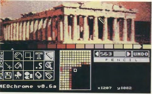 Auffällig bei NEOchrome ist der zweigeteilte Bildschirm. In der oberen Hälfte befindet sich ein Teil des Bildes, darunter ein Farbbalken mit den 16 verwendbaren Farben. Außerdem ist im unteren Teil noch das Menü mit den Malutensilien und ein Feld mit dem Farben Spektrum. Wenn der Mauspfeil in der oberen Bildschirmhälfte ist, zeigt dieses Feld die Vergrößerung der Pfeilumgebung. Dies ist eine sehr praktische Einrichtung, die das Arbeiten sehr erleichtert. Wie auch bei den anderen Programmen kann man malen, Linien ziehen, Text schreiben, farbig ausfüllen, löschen und Ausschnitte kopieren.